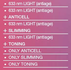 Possible combinations between ANTICELL/SLIMMING/TONING programs and the photo-biostimulation protocols are as follows: